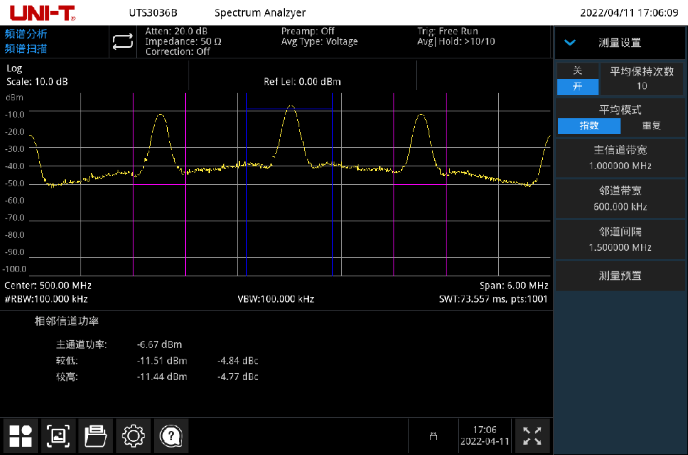 主信道功率, 左鄰道功率/功率比, 右鄰道功率/功率比 |