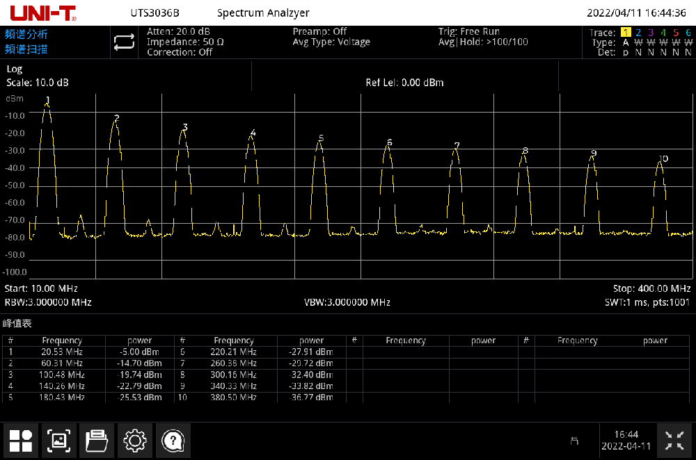 UTS3000B系列設置正峰,負峰,采樣,標準,平均,準峰等多種檢波方式,便于分析不同類型的信號 |